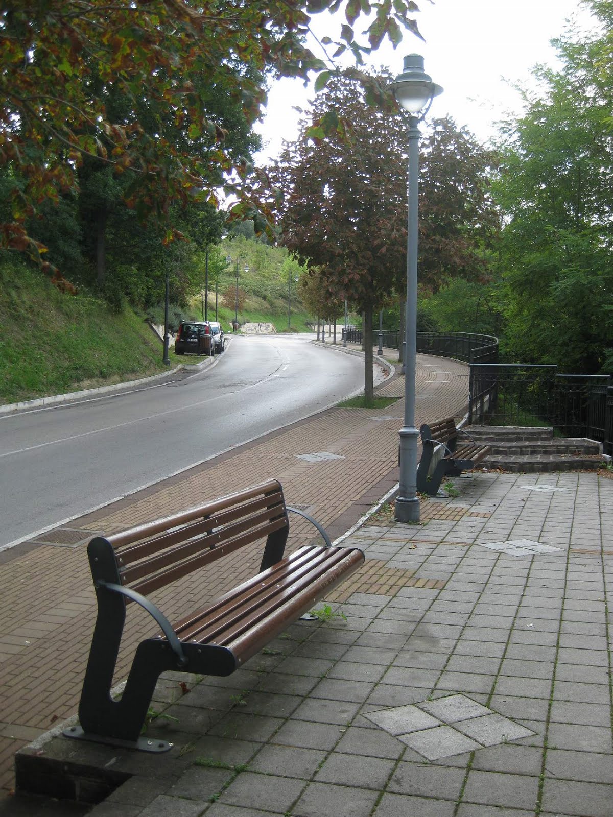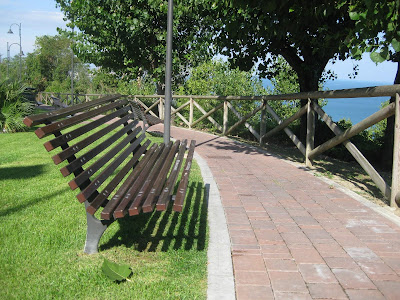 A series of benches photographed in Gabicce Monte, along the scenic road that connects with and around Gabicce Mare note disco Baia Imperiale. Along a bike path? Along a road? Faced with a luxuriant bush!